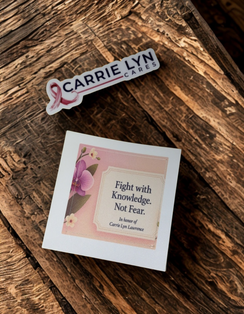 This CLC Sticker Bundle includes two distinctive decals: a glossy 3" x 0.86" sticker featuring the CLC logo, and a matte 2" x 2" sticker displaying the CLC slogan honoring Carrie Lyn. Each sticker offers durable quality and visual appeal, suitable for personalizing laptops, water bottles, or other surfaces while showing support for the Carrie Lyn Cares Foundation.